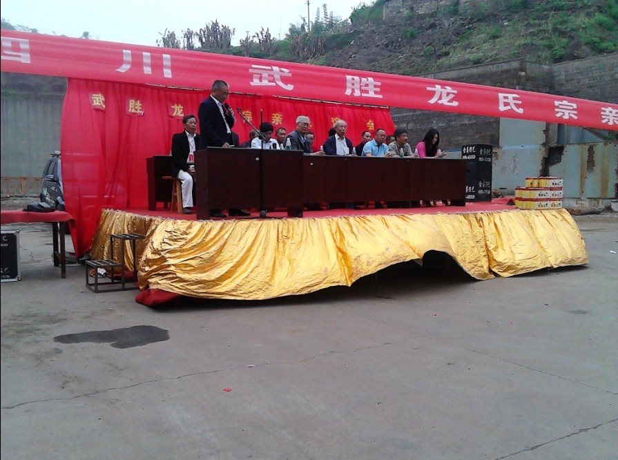2013年4月2日上午,中国四川武胜县龙氏宗亲联谊会隆重召开。与会宗亲1100人左右,豪情满怀地从各地赶来,莅临位于武胜县城嘉陵江大桥旁的由龙光明宗亲创立的四川广安鑫光电力铁塔有限公司老厂内的武胜龙氏宗亲联谊会会场。除武胜本地宗亲外,还有从四川各地、重庆等地赶来与会的好几十位龙氏宗亲。大会进行了一个小时左右,随后一百十四桌左右的宗亲聚餐,边吃边谈,亲热无比。很多宗亲边吃饭边浏览新编的家谱,欣喜万分!