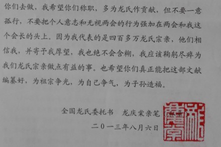 (六)近日收到湖南茶陵XX宗亲的训示,说我这个会长“不称职”,不出钱不出力。这“三字”示训,我暂时表示接受。XX宗亲虽说我不称职,但我问心无愧;我不出钱不出力,却有自知之明:我不揽权,编纂《通鉴》全权委托你们去做,我希望你们称职,多为龙氏作贡献,但不要一意孤行,不要把个人意志和无视两会的行为强加在两会和我这个会长的头上。因为我代表的是四百多万龙氏宗亲,他们相信我,并寄予我厚望,我也绝不会含糊,我应该鞠躬尽瘁为我们龙氏宗亲做点有益的事。也希望你们真正能把这部文献编纂好,为祖宗争光,为自己争气,为子孙造福。