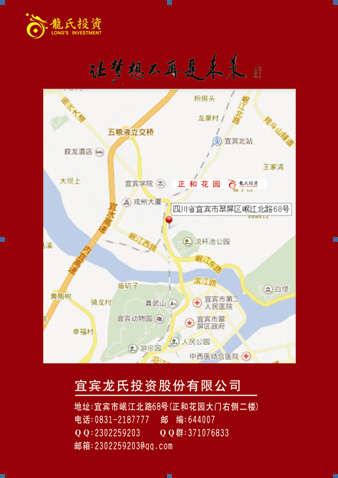 宜宾龙氏投资股份有限公司于2014年3月经四川省宜宾市工商行政管理局正式登记注册的综合性投资股份有限公司,公司注册资本金1000万元。公司立足宜宾,面向全国致力于社会各种资源的整合、运作和开发,主要经营范围:项目投资、投资顾问、投资咨询、中小企业及个人资产管理等。公司地址:宜宾市岷江北路68号(正和花园大门右侧二楼)。 宜宾龙氏投资股份有限公司将以“诚信、稳健、共赢、发展”为宗旨,秉承“市场化、规范化、科学化、人性化“的经营理念。以市场需求为导向,以创新管理为动力,以品牌经营为核心,以资源运营为手段,力争将公司建设成为具有较强竞争力、影响力、可持续发展力,多元化、规模化的大、中型投资企业。积极务实的理念是企业发展的根本保证。公司坚持以合法性、安全性和效益性为基本准则,以提高中小企业及个人信用、解决其难题为出发点,以谋求与中小企业及个人共同发展为目的,坚持市场化运作、法人化管理、专业化操作,遵循防范风险、化解风险、诚实守信的经营原则,充分发挥自身项目来源广泛、人脉资源丰富、实践经验丰富的优势,为广大的合作方搭建通往成功的桥梁。我们非常重视资源价值的共享与整合,致力于与我们的投资伙伴及我们所投资的企业建立紧密的伙伴关系。在此,让我们再次衷心感谢您对宜宾龙氏投资股份有限公司的热情关注与支持!