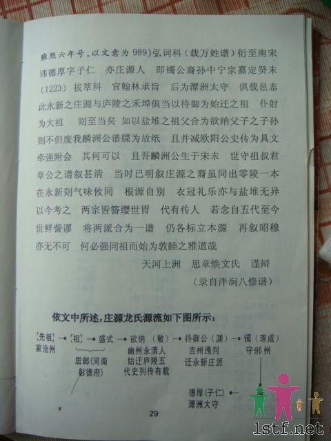 庄源老谱中世系第32世到40世是以偏旁为字派,其间又含有五行“木、火、金、水、土”这在现有的龙氏谱中可谓极为罕见.且33、34、35、37、38、39、43、44世、46世更是一绝,将偏旁和字号两者相互统一结合为同辈字派更是独树一帜.