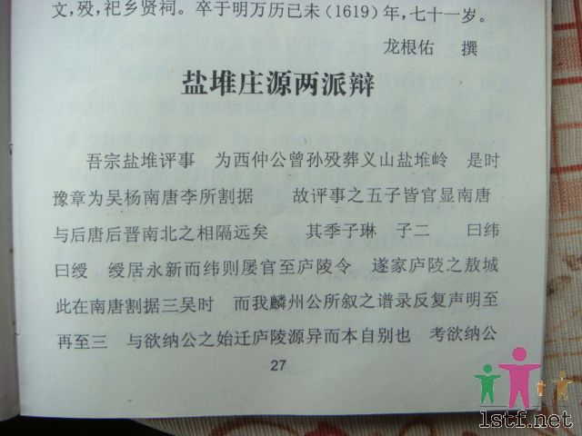 我个人认为:庄源龙氏与盐堆龙氏同属伯高公后裔无疑,为龙氏主要派系之一,二者应分派于两晋以后。两派发展均很强劲,尤其在唐宋时期几乎难分伯仲,期间因同居江西永新及周边一带,当地分支又多次分别联宗合谱,导致两派几乎合二而一,尤以世系混淆不清。故从唐、宋朝起,就曾有许多龙氏先贤能人均为考证庄源和盐堆之别而大伤脑筋。庄源龙氏自元朝起多数归隐山野,逐渐衰微,而此时的盐堆龙仍然保持较好的发展,庄源龙嗣孙与盐堆龙嗣孙逐渐融合,庄源龙氏后裔多支也先后被误列入盐堆琮公派之后。其中庄源龙氏比较有代表性的人物如:慊、思、敬、溥、翰、德、直、议、诚、讷、诘、戡、戬、时行、时举、时升、时茂、时飞等,上述人物在宋、元、明三朝年间的江西庄源老谱序上都曾分别有明确记载,包括黄庭坚、文天祥等所写谱序中都曾说明。故现在知盐堆者多,闻庄源者少。目前经查实:江西永新庄源支、湖南资兴支、四川屏山龙华支、重庆大足万古支、贵州瓮安银盏支,同为庄源龙姓后裔。